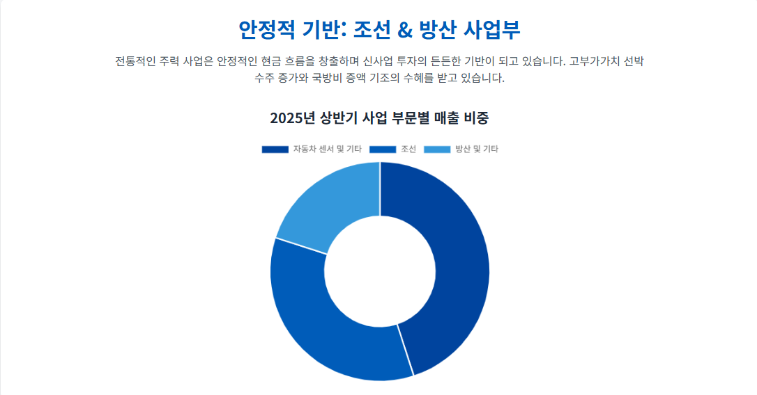 전통적인 조선 및 방산 부문의 안정적인 기반 위에 고성장 산업인 자동차 센서 사업을 성공적으로 안착시키면서 기