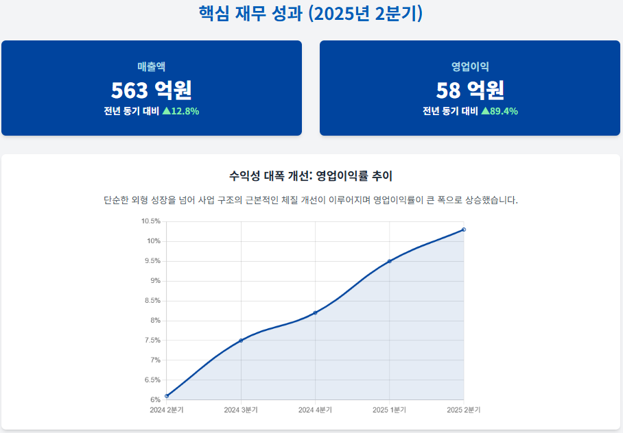 매출액 563억 원(전년 동기 대비 12.8% 증가)과 영업이익 58억 원(전년 동기 대비 89.4% 증가)을 기록하며,
