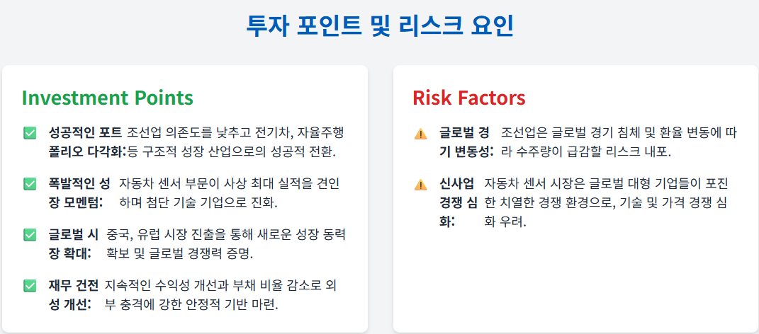- 성공적인 사업 포트폴리오 다각화: 경기 변동에 민감한 조선업 비중을 점진적으로 줄이고, 전기차 및 자율주행차라는 구조적 성장 산업으로의 사업 전환에 성공했습니다. 이러한 전략적인 움직임은 기업의 미래 성장성을 더욱 확실하게 만들고 있습니다.