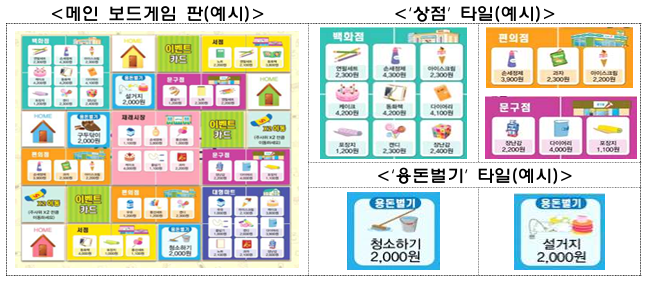 <메인 보드게임 판(예시)> <‘상점’ 타일(예시)> <‘용돈벌기’ 타일(예시)> 학습 효과는 무엇일까요?