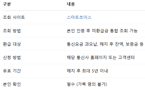 스마트초이스에서는 확인만 가능하고, 실제 환급은 통신사에서 진행해요.통신사홈페이지고객센터SKT www.tworld.co.kr → '요금조회 > 미환급금' 080-011-6000 KT www.kt.com → '마이페이지 > 미환급조회' 1588-0010 LG U+ www.lguplus.co.kr → '요금조회 > 환급금' 1544-0010 📞 전화 문의만으로도 상담원 안내에 따라 환급 가능합니다.